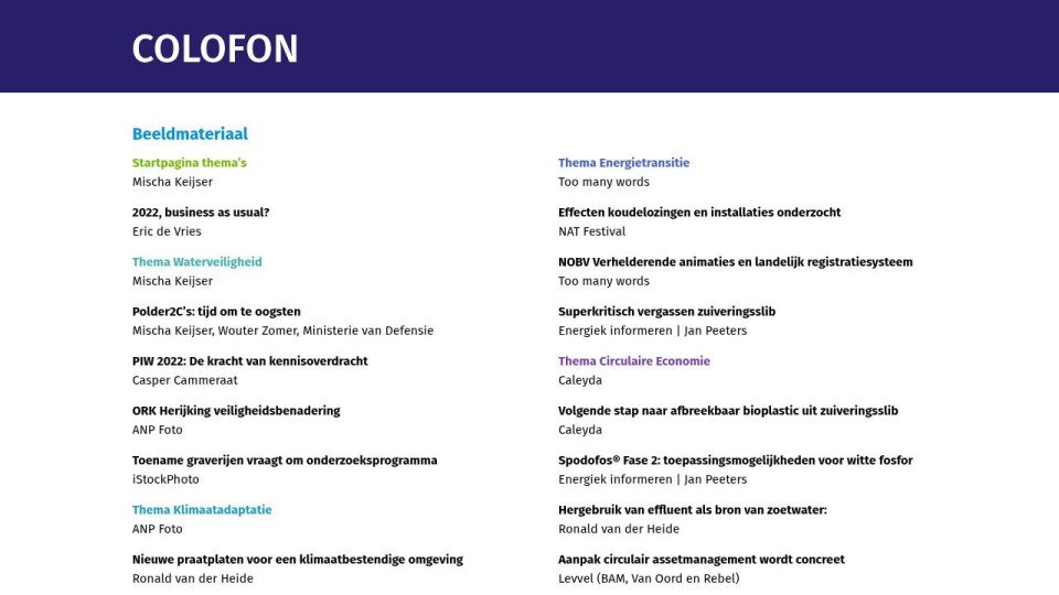 STOWA heeft geprobeerd alle rechthebbenden van het gebruikte beeldmateriaal te achterhalen. Dit is niet in alle gevallen gelukt. Mocht uw werk onvernoemd getoond worden in deze publicatie neem dan contact op met stowa@stowa.nl o.v.v. de pagina waarop uw werk te zien is en hoe u vermeld wilt worden in het colofon. Wij voegen uw gegevens dan zo spoedig mogelijk toe.