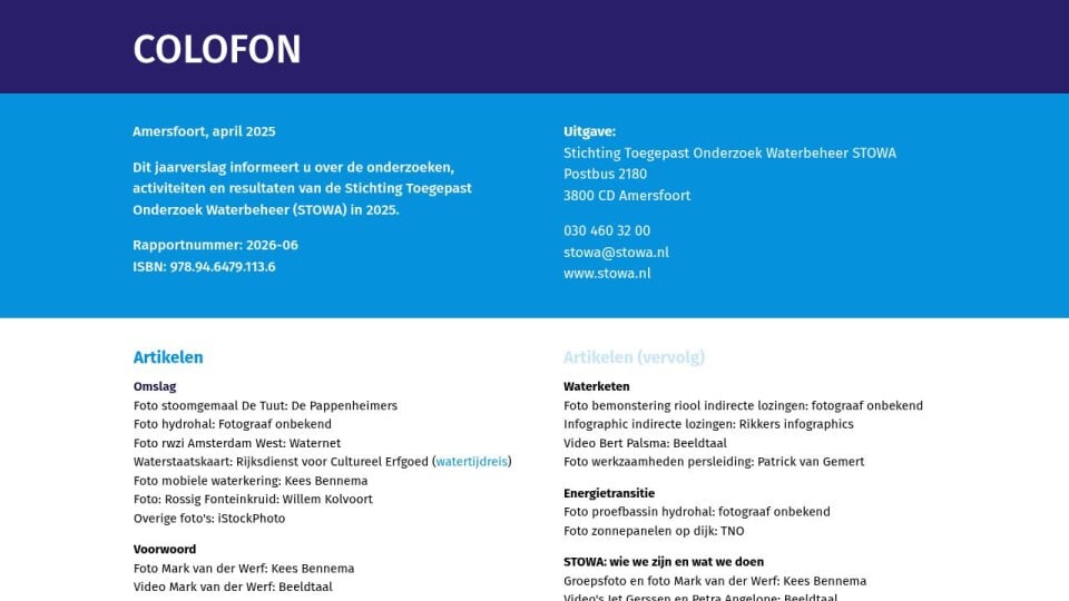 Dit jaarverslag informeert u over de onderzoeken, activiteiten en resultaten van de Stichting Toegepast Onderzoek Waterbeheer (STOWA) in 2025.