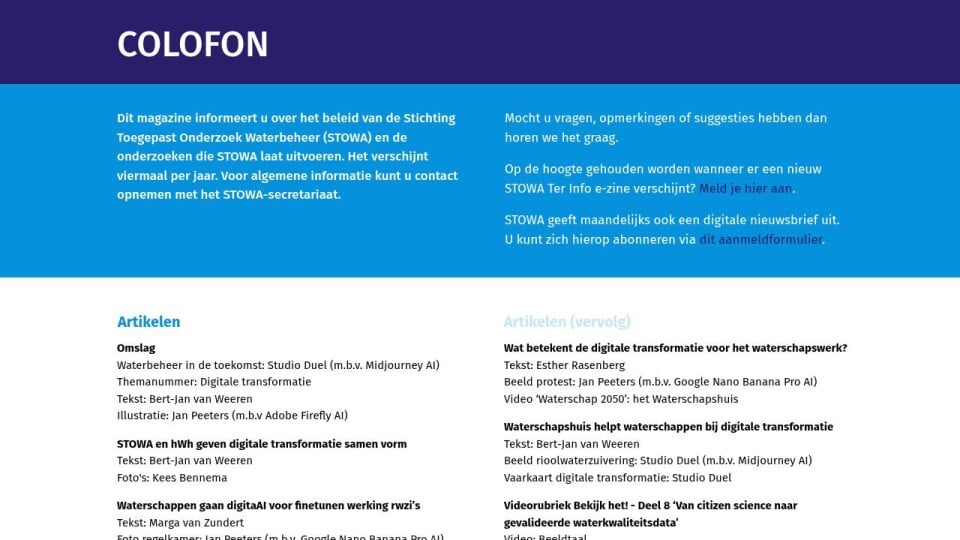 Dit magazine informeert u over het beleid van de Stichting Toegepast Onderzoek Waterbeheer (STOWA) en de onderzoeken die STOWA laat uitvoeren. Het verschijnt viermaal per jaar. Voor algemene informatie kunt u contact opnemen met het STOWA-secretariaat.