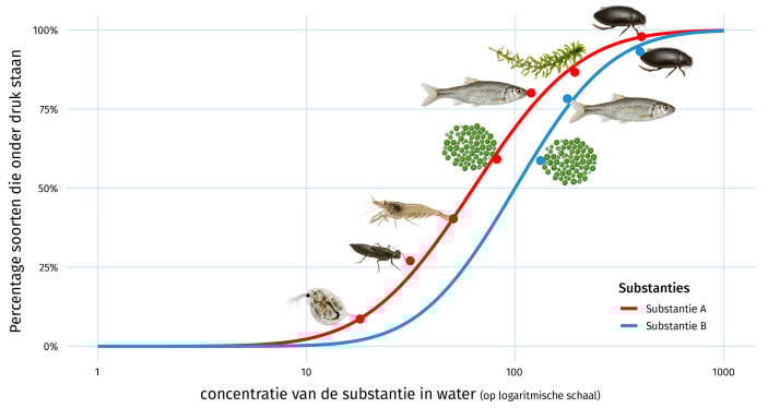 Het gaat om een vorm van AI die ook wordt gebruikt om Netflix-abonnees nieuwe kijksuggesties aan te bieden op basis van hun eerdere kijkgedrag. Slootweg: “Dat draait om het koppelen van films aan mensen. Wij gebruiken het eigenlijk om waterorganismen en stoffen te matchen. Leo [Posthuma, red.] gebruikt hiervoor vaak de analogie met een sudoku. Je hebt wat gegevens en daarmee kun je een hele puzzel oplossen.” Want de methode werkt voor stoffen waarvan wel wat toxiciteitsgegevens bekend zijn, maar niet de complete Species Sensitivity Distribution (SSD) die nodig is voor de SFT-rekentool. Een SSD is een logaritmische curve die aangeeft bij welke concentraties verschillende soorten organismen schade ondervinden. Je hebt er dus meetgegevens voor nodig van diverse organismen (bacteriën, algen, vissen, planten, kikkers). Het idee is dat AI op basis van minder metingen toch een juiste SSD kan voorspellen.