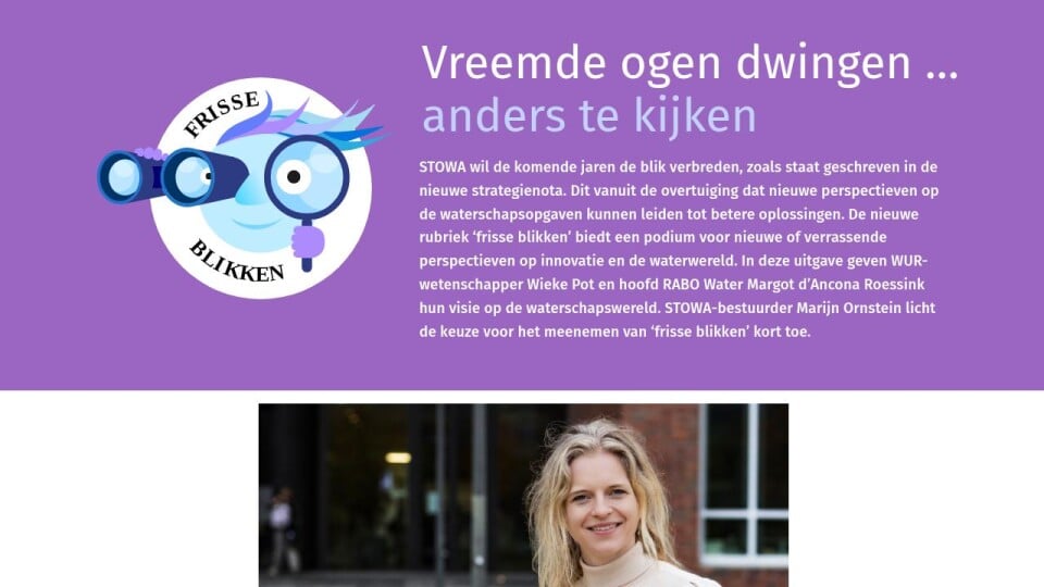 STOWA wil de komende jaren de blik verbreden, zoals staat geschreven in de nieuwe strategienota. Dit vanuit de overtuiging dat nieuwe perspectieven op de waterschapsopgaven kunnen leiden tot betere oplossingen. De nieuwe rubriek ‘frisse blikken’ biedt een podium voor nieuwe of verrassende perspectieven op innovatie en de waterwereld. In deze uitgave geven WUR-wetenschapper Wieke Pot en hoofd RABO Water Margot d’Ancona Roessink hun visie op de waterschapswereld. STOWA-bestuurder Marijn Ornstein licht de keuze voor het meenemen van ‘frisse blikken’ kort toe.